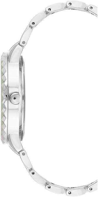 - Textured bezel with mineral crystal lens; silver-tone dial with matching hands and crystal accented markers